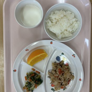 豚肉の甘酢胡麻和え 小松菜ともやしのおかか和え ご飯 牛乳 オレンジ