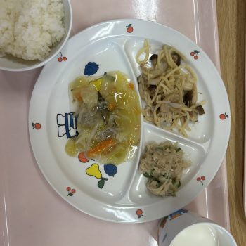 鱈の野菜あんかけ バンバンジーサラダ きのこスパソテー ご飯 牛乳